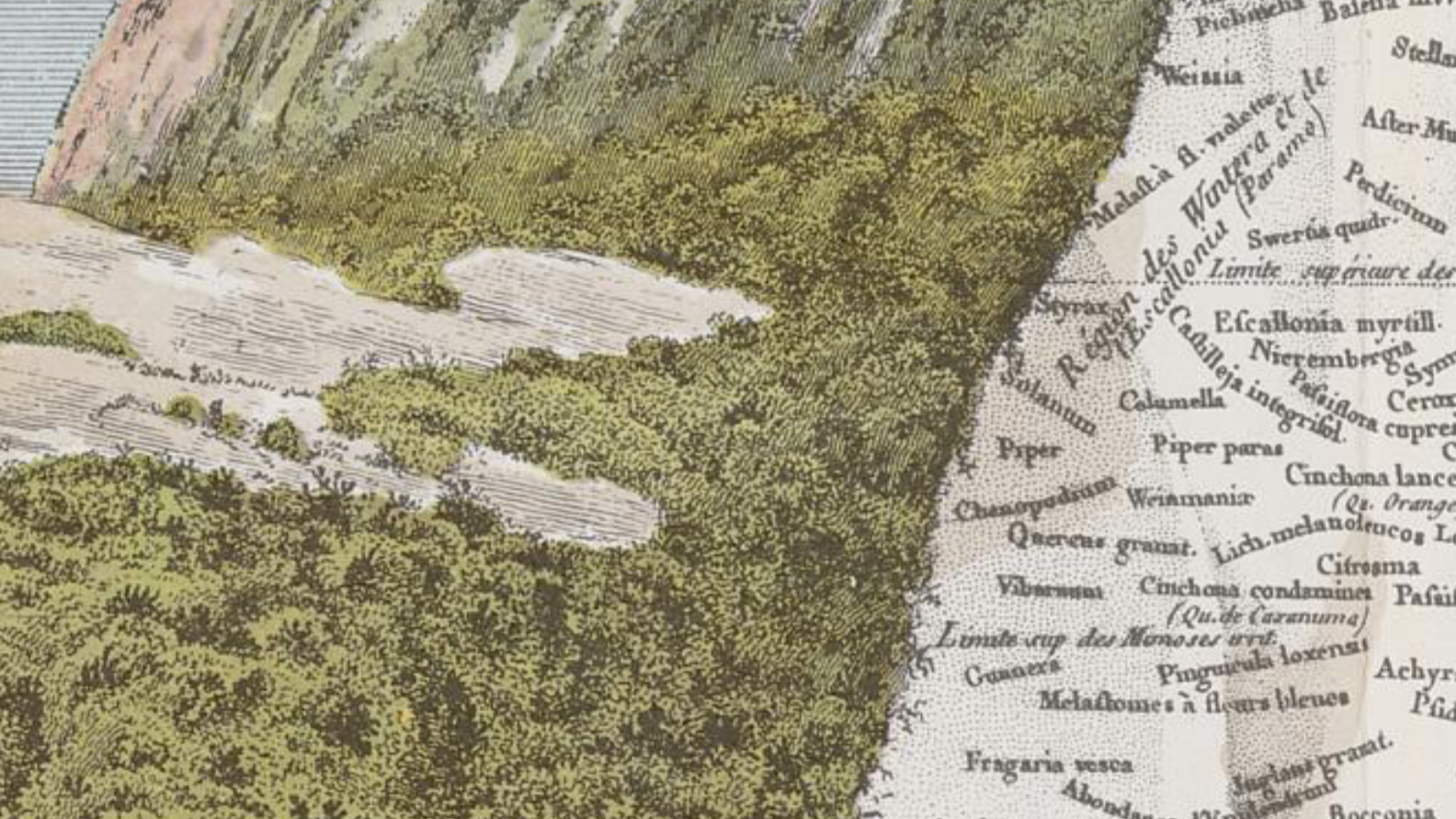 Das Tableau aus Alexander von Humboldts und Aimé Bonplands „Versuch über die Geographie der Pflanzen“ – ein transmediales Vexierbild, wo statt Pflanzen deren lateinische Namen auf dem Berg wachsen.