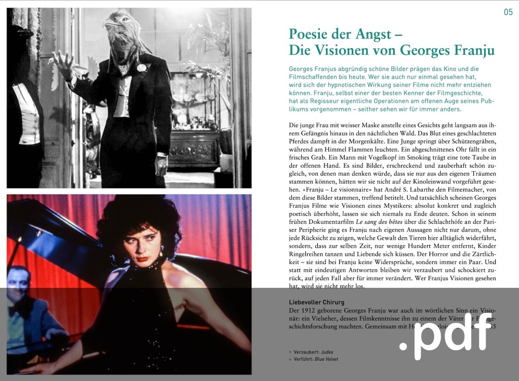 Die junge Frau mit weisser Maske anstelle eines Gesichts geht langsam aus ihrem Gefängnis hinaus in den nächtlichen Wald. Das Blut eines geschlachteten Pferdes dampft in der Morgenkälte. Eine Junge springt über Schützengräben, während am Himmel Flammen leuchten. Ein abgeschnittenes Ohr fällt in ein frisches Grab. Ein Mann mit Vogelkopf im Smoking trägt eine tote Taube in der offenen Hand. Es sind Bilder, erschreckend und zauberhaft schön zugleich, von denen man denken würde, dass sie nur aus den eigenen Träumen stammen können, hätten wir sie nicht auf der Kinoleinwand vorgeführt gesehen. «Franju – Le visionnaire» hat André S. Labarthe den Filmemacher, von dem diese Bilder stammen, treffend betitelt. Und tatsächlich scheinen Georges Franjus Filme wie Visionen eines Mystikers: absolut konkret und zugleich poetisch überhöht, lassen sie sich niemals zu Ende deuten. Schon in seinem frühen Dokumentarfilm Le sang des bêtes über die Schlachthöfe an der Pariser Peripherie ging es Franju nach eigenen Aussagen nicht nur darum, ohne jede Rücksicht zu zeigen, welche Gewalt den Tieren hier alltäglich widerfährt, sondern, dass zur selben Zeit, nur wenige Hundert Meter entfernt, Kinder Ringelreihen tanzen und Liebende sich küssen. Der Horror und die Zärtlichkeit – sie sind bei Franju keine Widersprüche, sondern immer ein Paar. Und statt mit eindeutigen Antworten bleiben wir verzaubert und schockiert zurück, auf jeden Fall aber für immer verändert. Wer Franjus Visionen gesehen hat, wird sie nicht mehr los.