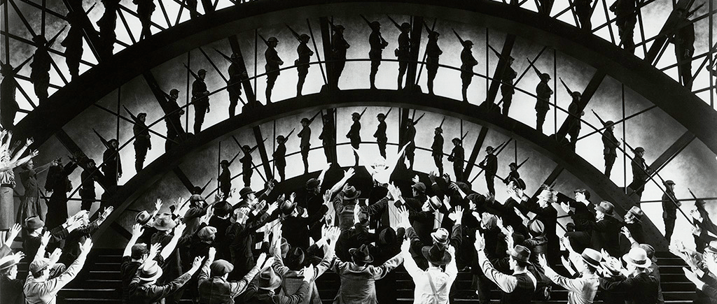 Berkeley scheint mit solchen Inszenierungen fortzuführen, was King Vidor in seinem Stummfilm «The Crowd» von 1928 als Bedenken formulierte: Dort wird der Auflösung des Individuums im Gewühl der industrialisierten Moderne porträtiert. Vidors Protagonist John Sims, der sich bei seiner Ankunft in New York über die Passanten lustig macht und von sich behauptet, er werde es noch weit bringen, endet nicht an der Amerikas Spitze sondern als Teil der uniformen Masse. Aus dem ambitionierten Individualisten, dem prototypischen Verfechter des american dream wird der Büroangestellte Nr. 137, ein weiteres unbekanntes Gesicht in der Menge der Arbeiter. Ganz anaolog scheinen auch Berkeleys Choreographien als Sinnbilder des Maschinenzeitalters zu fungieren. So wie Siegfried Kracauer 1927 in seinem Essay «Das Ornament der Masse» die synchron bewegten Beine von Revuetänzerinnen mit den Händen von Fabrikarbeitern gleichsetzt, lesen Kritiker auch Berkeleys ornamentale Massenszenen mit Vorliebe vor dem Hintergrund der rationalisierten Arbeitsprozesse in der Grossindustrie: die Technik des Fliessbands, wie es Henry Ford in den frühen Zehner Jahren in seine Autowerken einführt, bestimmt nun auch die Darstellungsweisen der Unterhaltungsindustrie.