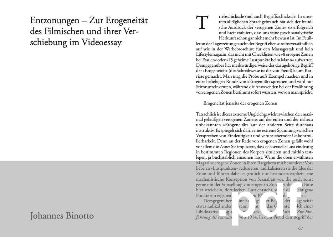Abstract: Neben den berühmten erogenen Zonen ist Freuds Begriff der Erogeneität in seiner Radikalität eher unbemerkt geblieben. Dabei eignet er sich gerade wie kein anderer, um einen anderen Blick auf die Bedeutung des Filmischen für unser Verständnis von Sexualität zu werfen: Filme stellen Sexualität nicht einfach dar, sondern konzipieren sie laufend neu als unabschließbaren, sich laufend verschiebenden Prozess. Das neue Format des Videoessays erweist sich als ideales Medium, diese Erogeneität des Filmischen zugleich experimentell zu erforschen und am eigenen Körper mitzuspielen.