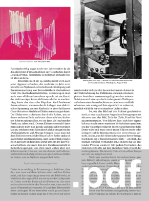 Dabei ist es wichtig in Erinnerung zu behalten, dass das, was man auf dem Schirm einer solchen Röhre sieht, auf das träge Auge zwar wie ein Bild wirkt, in Wahrheit aber eigentlich nur ein rasender Lichtpunkt ist. Von daher auch der Eindruck des Flimmerns, der einst so charakteristisch für den Fernseher war, dass man ihn auch «Flimmerkiste» nannte. Wo auf dem Filmstreifen eines analogen 35mm-Films immerhin noch ganze Einzelbilder zu finden waren, zeigt das Fernsehen nur einen wandernden Lichtpunkt, dessen horizontale Linien in der Wahrnehmung des Publikums erst wieder zu kompletten Ansichten zusammengefügt werden muss. Sieht man sich eine 400fach verlangsamte Zeitlupenaufnahme eines Fernsehschirms an, wird man verblüfft erkennen, wie wenig auf ihm eigentlich zu sehen ist, nämlich wirklich nur ein einzelner Lichtstreifen. «Der Modus des Fernsehbildes hat nichts mehr mit Film oder Fotografie zu tun» kann darum Marshall McLuhan in «Understanding Media» schreiben. «Das Fernsehbild ist keine Einzelaufnahme. Es ist in keinerlei Hinsicht einem Foto vergleichbar, sondern es ist eine endlos sich formende Kontur der Dinge, von einem Tastfinger gemalt.» Das mag erklären, warum McLuhan das Fernsehen zu den «kühlen Medien« zählt, zu jenen also, die arm an Daten sind und darum eine umso grössere Mitarbeit von Seiten der Zuschauer_innen benötigen. Auf den kleinen Bildschirmen der Fünfzigerjahre, wie sie McLuhan noch vor Augen hat, mit ihrem grobkörnigen verrauschtem Schwarzweiss, ist tatsächlich nur mit einiger Anstrengung etwas zu erkennen. Doch auch mit bis heute stetig sich erhöhender Pixelzahl und Zeilengeschwindigkeit bleibt die Grundoperation dieselbe: So wie das Bild auf den Schirm geschrieben wird, so muss auch unser Auge diese Bewegungen mitabtasten und das Bild, Zeile für Zeile, Pixel für Pixel zusammensetzen. Wer in die Röhre schaut, ist eigentlich unentwegt am Puzzle spielen. So hält auch die Videotheoretikerin Yvonne Spielmann fest, dass von Bildern hier eigentlich nur noch unter massiven Vorbehalten zu sprechen ist. Denn während man sonst unter Bildern mehr oder weniger stabile Repräsentationen «von etwas» versteht, ist das, was der elektrische Apparat hervorbringt höchstens ein «Transformationsbild» – ein Bild, das niemals wirklich vorhanden ist, sondern nur als laufender Prozess existiert. Mit jedem Vorrücken des Elektronenstrahls auf den nächsten Platz, erlischt der vorhergehende. Die Ansicht löst sich im selben Tempo auf, wie sie aufgebaut wird.